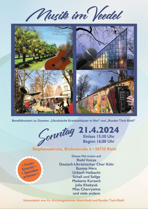 21.04.2024 | Benefizkonzert des Runden Tisches Riehl in der Stephanuskirche, Brehmstraße 6, Köln-Riehl | |